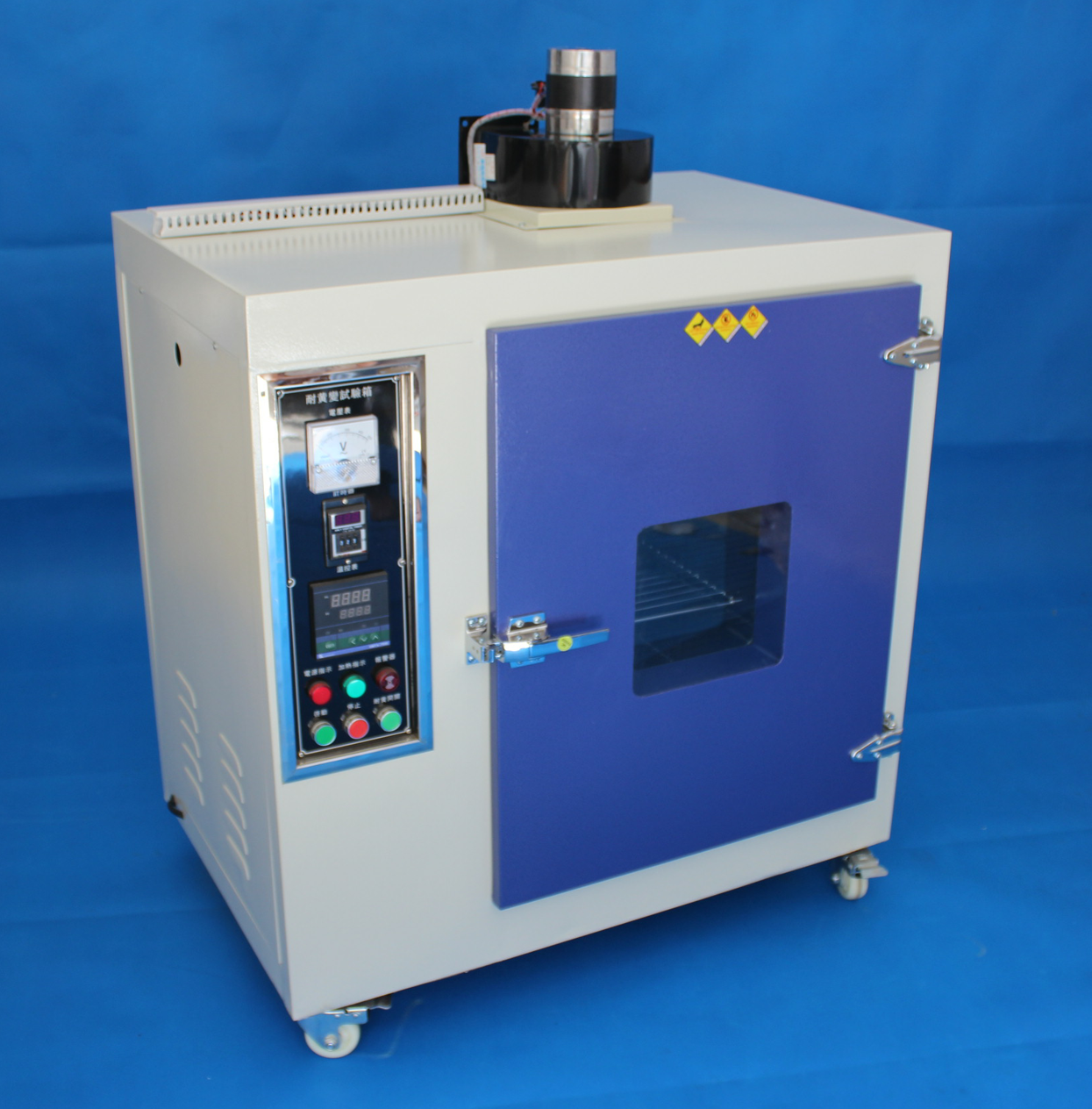 用于材料的黃變加速試驗(一般在70℃時材料此箱內試驗3小時相當于自然界環境中2個月黃變結果)??捎梦廴净疑珮俗鰠⑴卸ú牧宵S變等級。也可以目測材料的黃變程度
